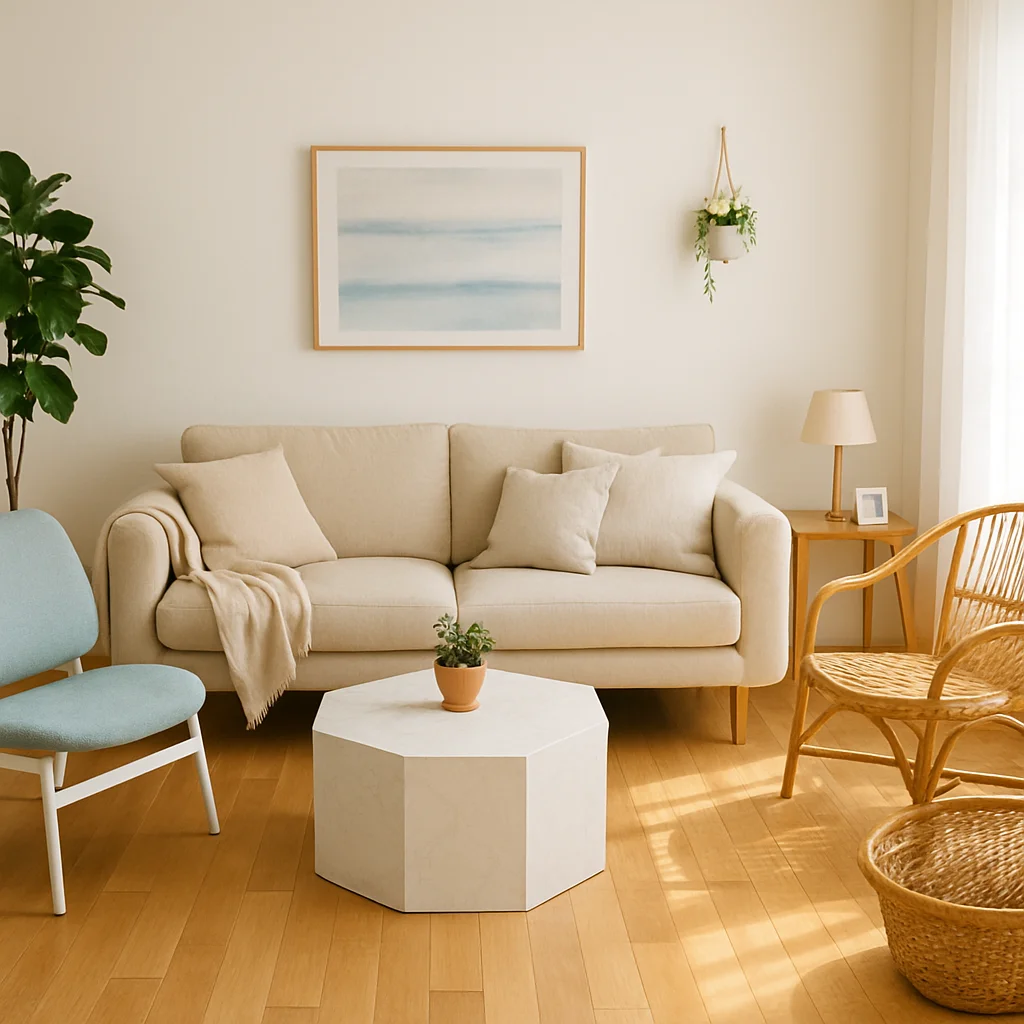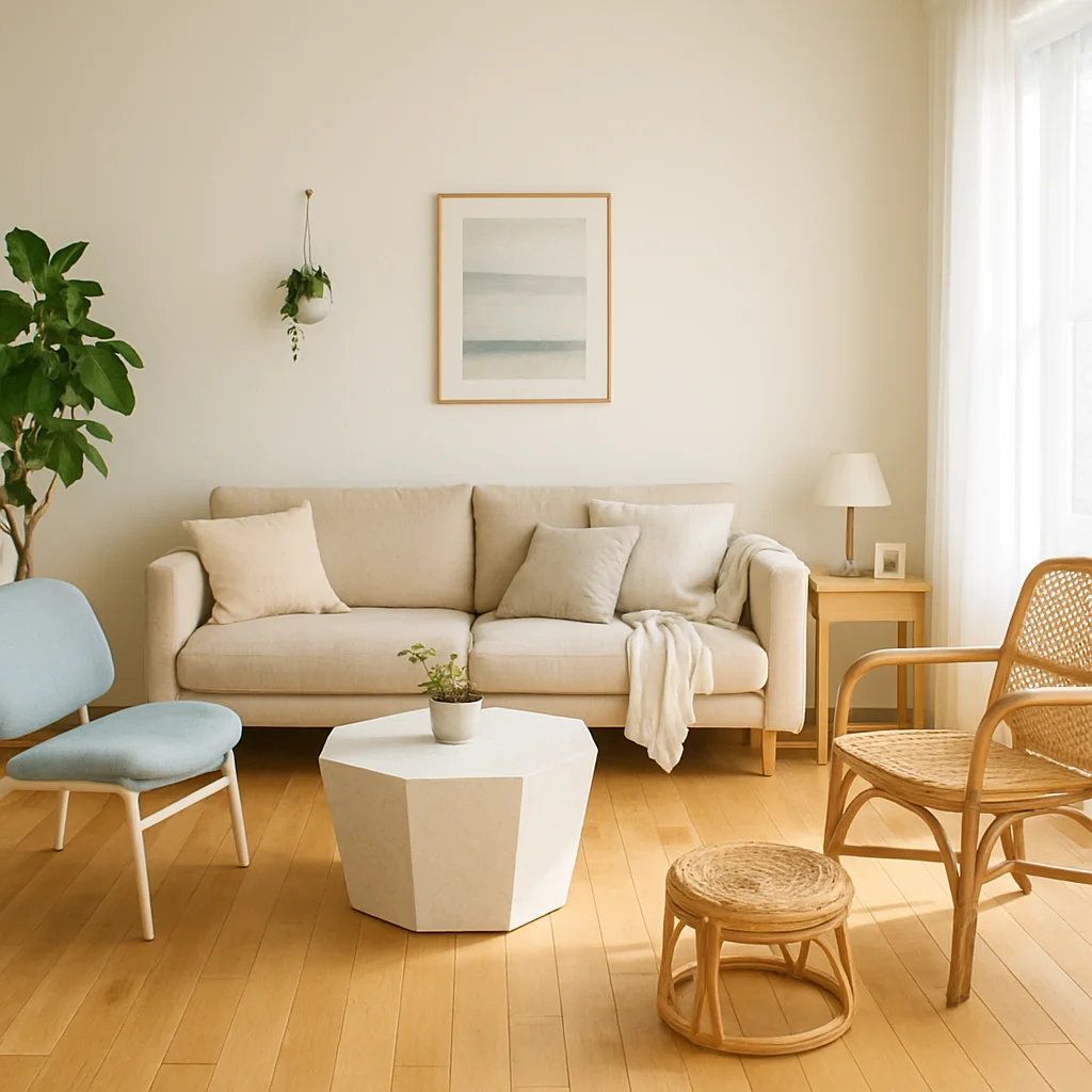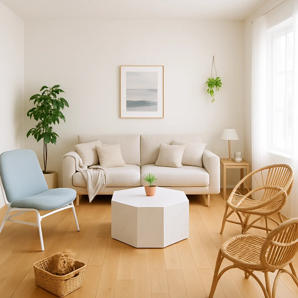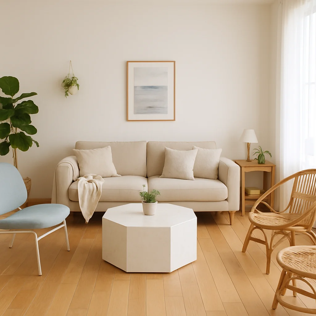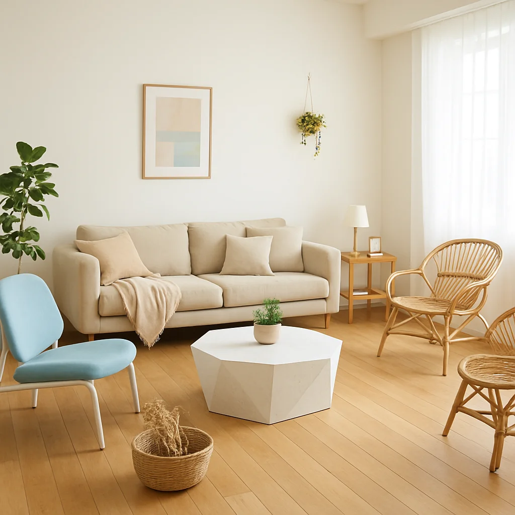 ベージュとウッドを基調とした落ち着いたインテリアの撮影スタジオ。最大8名収容可能で、個人利用にもおすすめです。