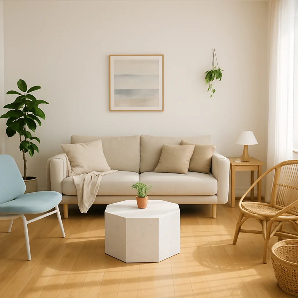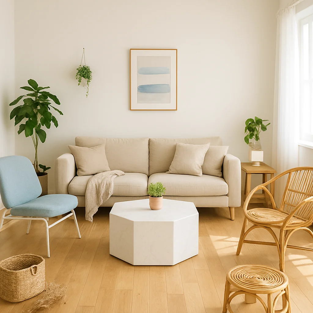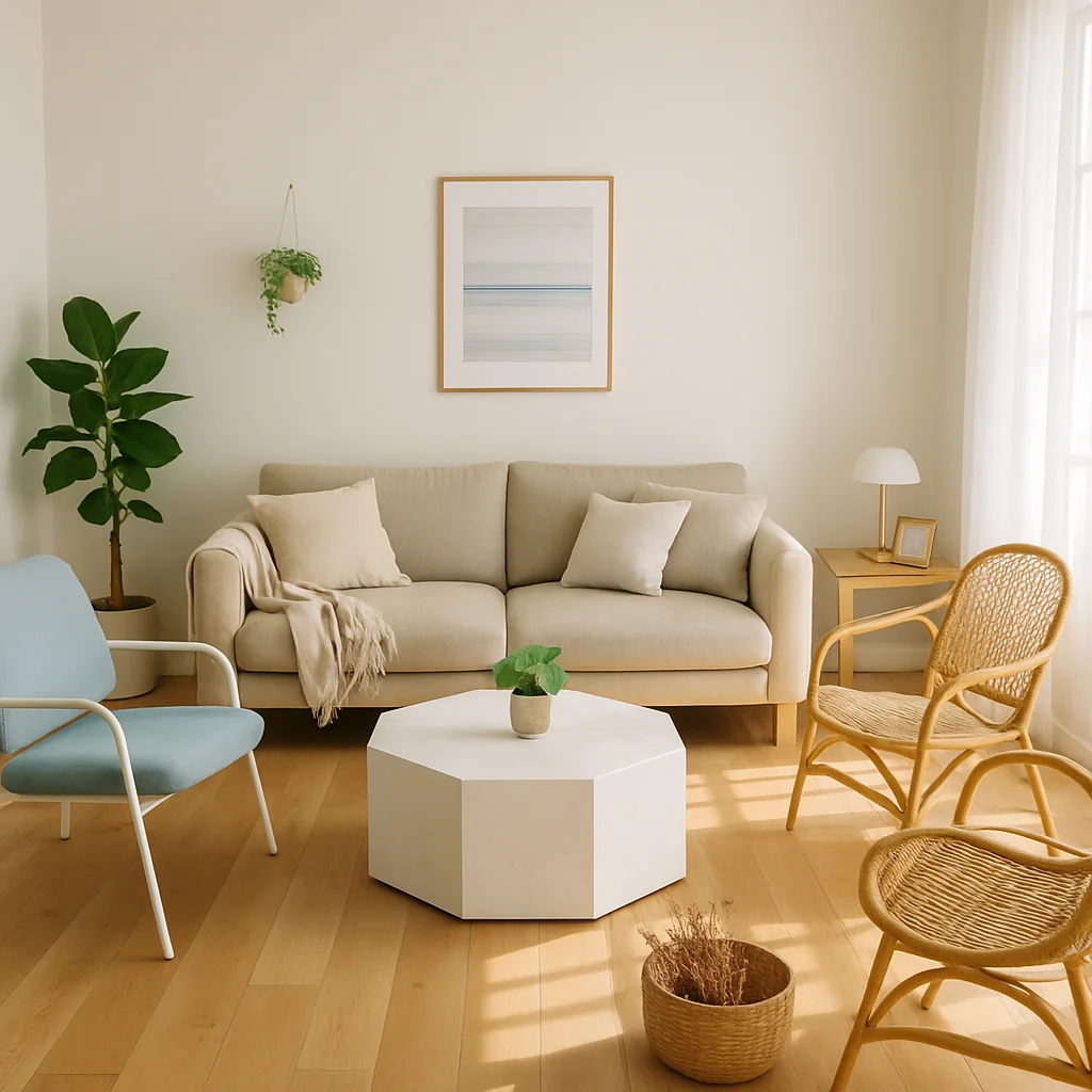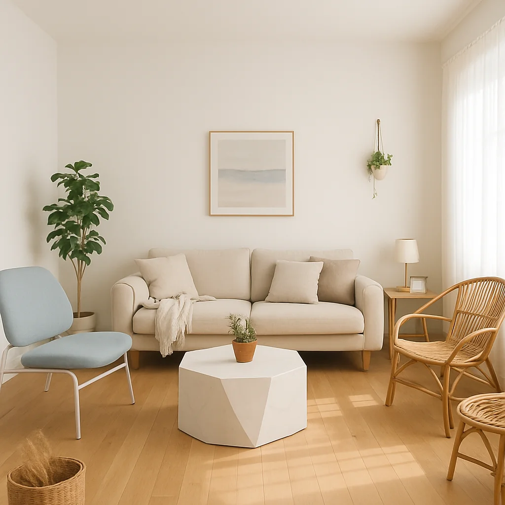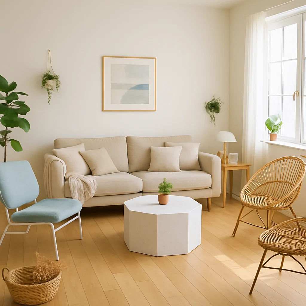 ベージュとウッドを基調とした落ち着いたインテリアの撮影スタジオ。最大8名収容可能で、個人利用にもおすすめです。