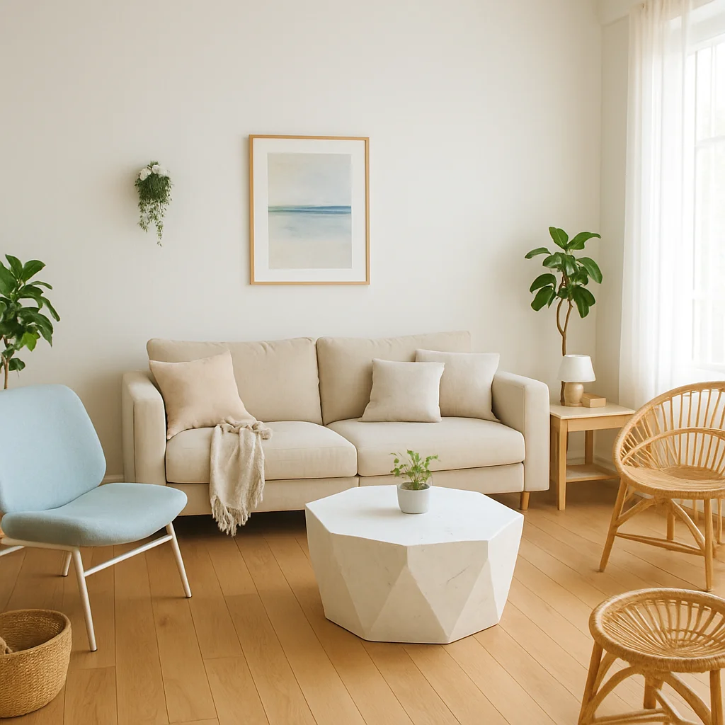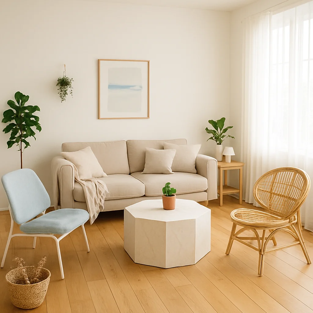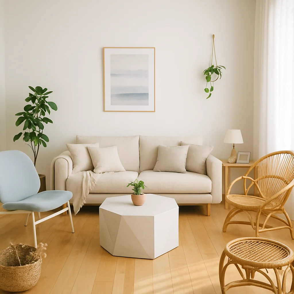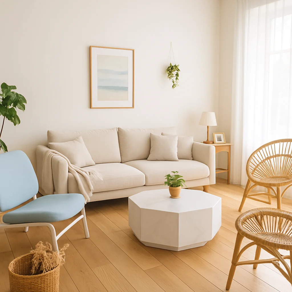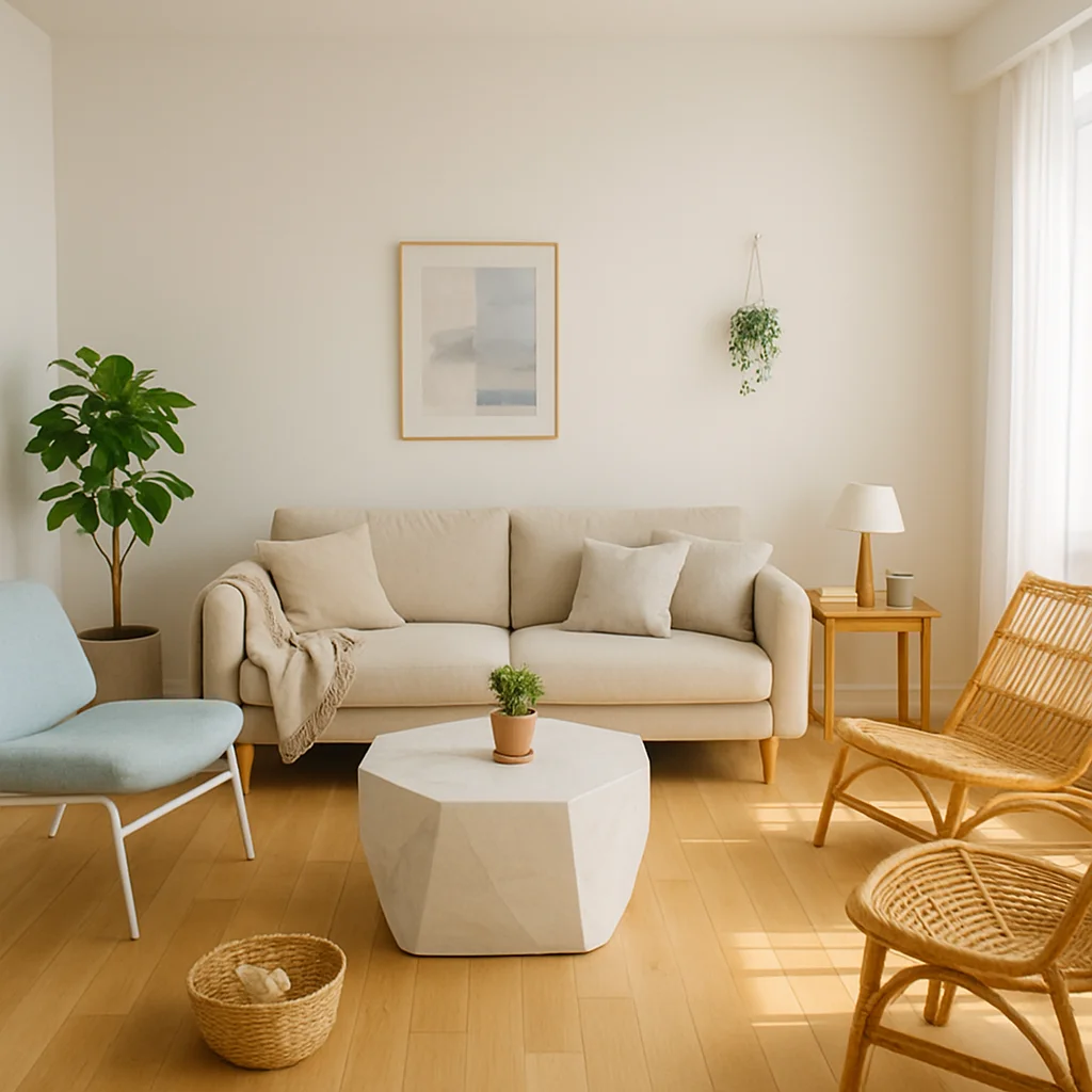 ベージュとウッドを基調とした落ち着いたインテリアの撮影スタジオ。最大8名収容可能で、個人利用にもおすすめです。