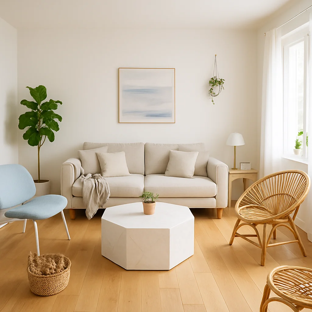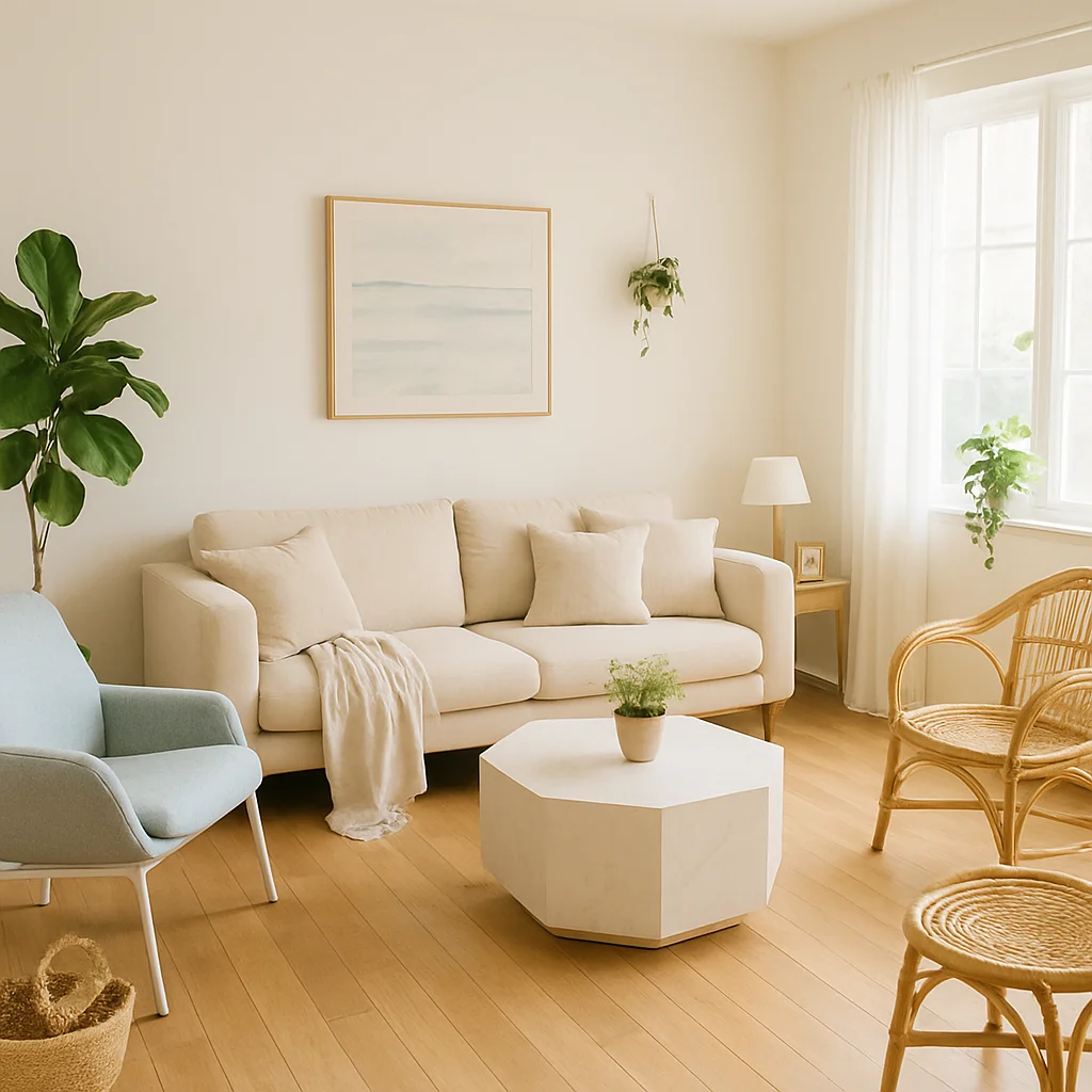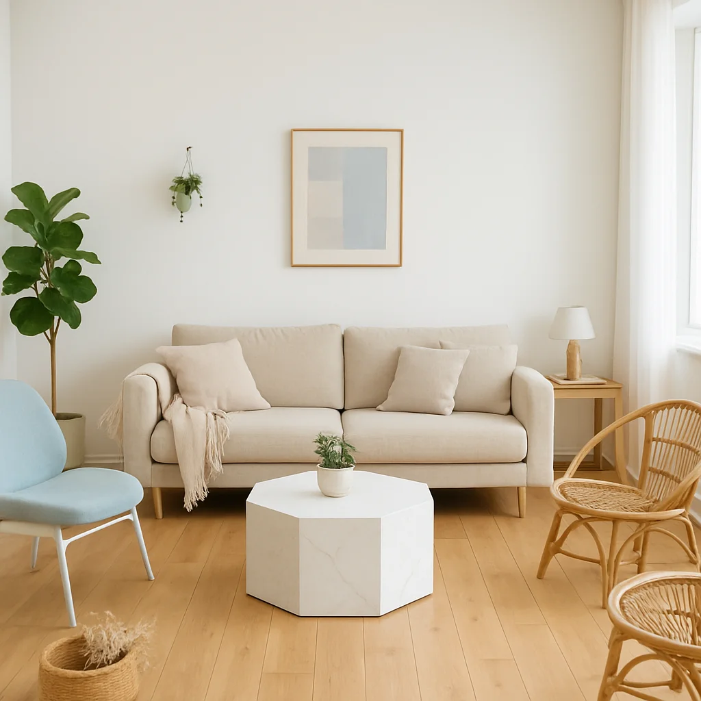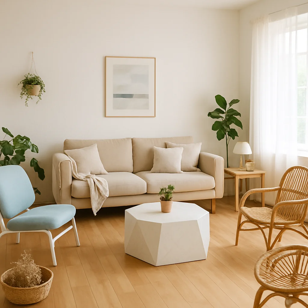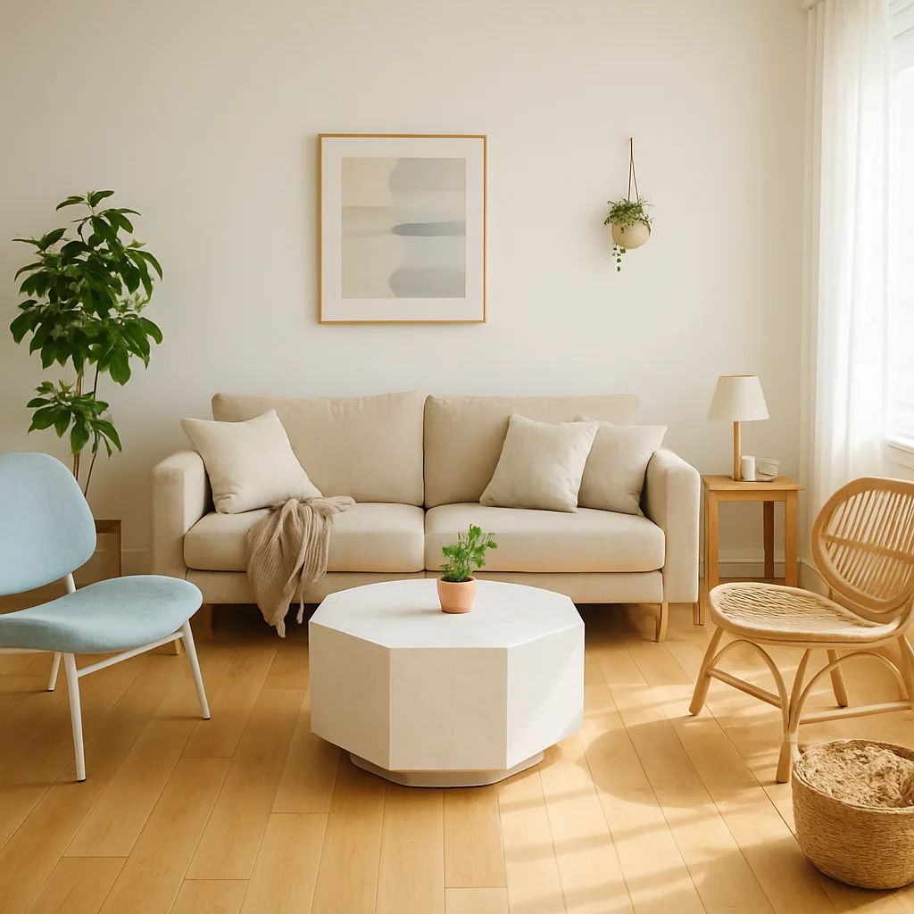 ベージュとウッドを基調とした落ち着いたインテリアの撮影スタジオ。最大8名収容可能で、個人利用にもおすすめです。