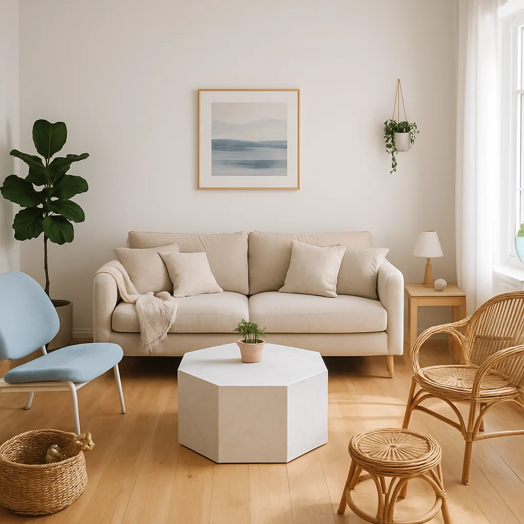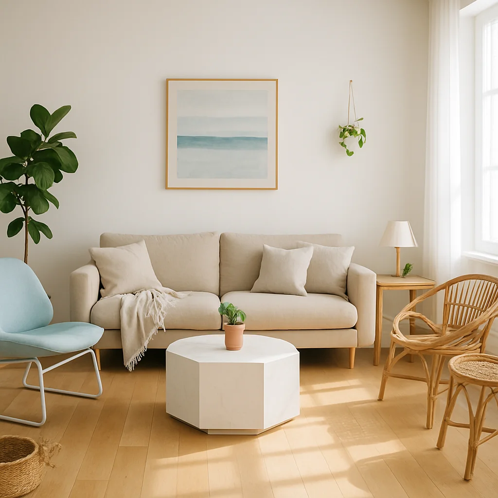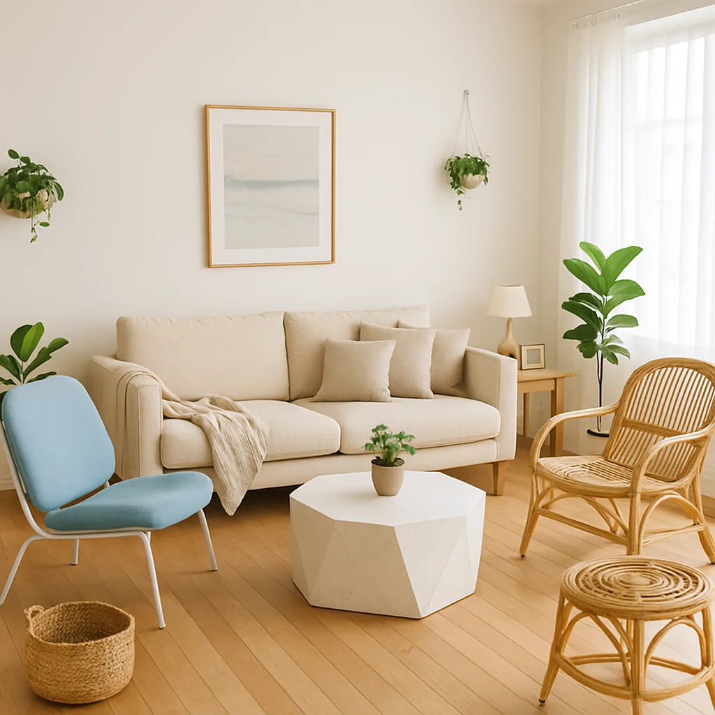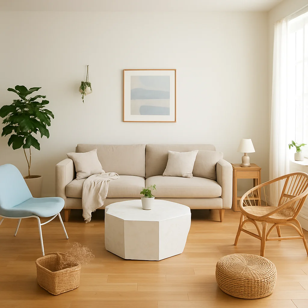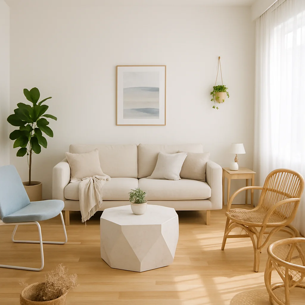 ベージュとウッドを基調とした落ち着いたインテリアの撮影スタジオ。最大8名収容可能で、個人利用にもおすすめです。