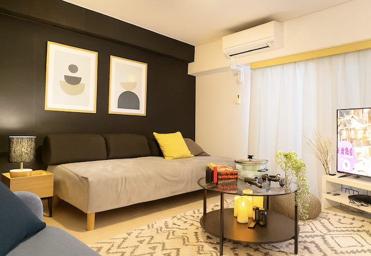 25㎡のコンパクトな間取りながら、大型ソファ、間接照明、質感の異なる壁面が揃い、 画づくりに変化を持たせやすい構成となっています。 55型テレビやゲーム機、高速Wi-Fi、キッチン設備など、 生活感と演出性を両立できる要素が充実しており、 ライフスタイル表現を含む制作や、静かな語り口のインタビューにも適した 都会型の撮影スタジオとして活用されています。 “撮りやすさ・使いやすさ・整いすぎない心地よさ”がここにはあります。