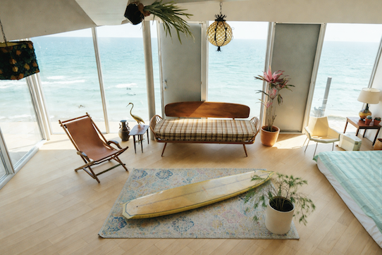 ミッドセンチュリーのヴィンテージ家具を揃えたリゾートワンルームがあります。夕日や富士山が望めるロケーションで、家具との相性も抜群ですよ