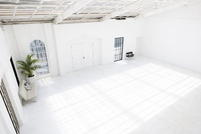 はい、15m四方・高さ最大5.2mの大空間スタジオがあります。天井から自然光が降り注ぎ、床や壁に反射して純白の光が広がりますよ