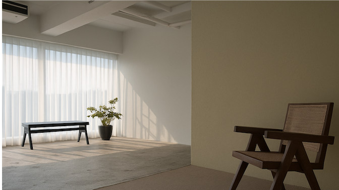 4Fでは柔らかい光が白壁と左官壁を包み込み、