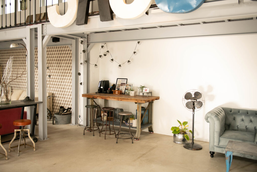 NYの工房のようなスタジオ。 コンクリートの床にタイル壁やカラフルな壁、家具や小道具はNYテイストのもので統一され、様々なシーンの撮影におすすめです! 2階部分から俯瞰での撮影も可能です。