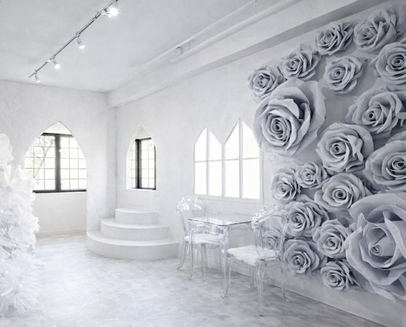 巨大なバラ壁と白いジャイアントフラワー、漆喰の白壁、光のニュアンスが変化する格子窓など、どの角度からカメラを構えても画になる構成は、“ファンタジーを美しく残す”というテーマに最適。台東区で幻想的な世界観を撮りたいクリエイターにおすすめできる撮影スタジオで、人物撮影でも商品撮影でも、光と背景の相性が非常によいため、作品の説得力が一段と高まります。